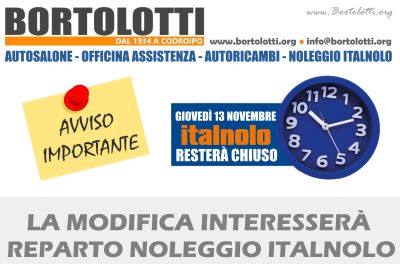 Si avvisa la clientela che per esigenze interne GIOVEDÌ 13 NOVEMBRE il centro noleggio Italnolo resterà CHIUSO tutto il giorno.Notizia del 30/10/2025 - Scad. 14/11/2025